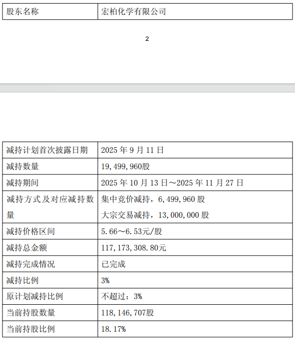 公司公告于2025年9月11日刊出了关于控股股东宏柏化学计划在公告发布后的十五个交易日后的三个月内(自减持时间2025年10月13日至2026年1月12日)以集中竞价和/或大宗交易的减持方式减持公司股份不超过总数的3.0%。