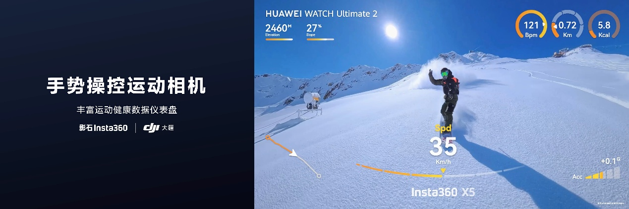 划一划和敲一敲手势可以用来操控手表交互,使其更加自然流畅。当用户无法通过触屏操作时,依旧能够轻松完成接听或挂断电话、切换音乐、关闭闹钟或是手机拍照等任务。“敲一敲”的功能还能与大疆和影石等第三方运动相机连接起来,用户可以通过手表上的“敲一敲”实现对相机的控制,打造出一种便捷的操作方式。这种全场景互联的能力让智能生活变得更加触手可及,真正实现了用一块表管理智感生活的目标。