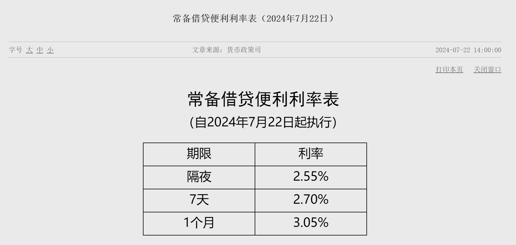 北京7月22日消息:中国人民银行于7月22日下午公布了更新后的常备借贷便利利率表,从2024年7月22日起,隔夜、7天以及1个月的常备借贷便利利率分别调整为2.55%、2.70%和3.05%,相较于此前均下调了10个基点。