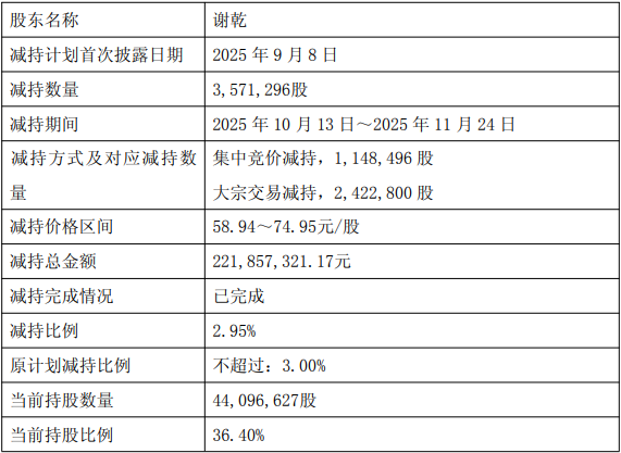 2025年10月13日至2025年11月24日,在集中竞价交易中谢乾共减持1,148,496股,而在大宗交易中谢乾又累计出售2,422,800股股份。总交易数量达到3,571,296股,价格区间从每股市价为58.94元到74.95元不等,并最终合计获得减持总额221,857,321.17元的资金。