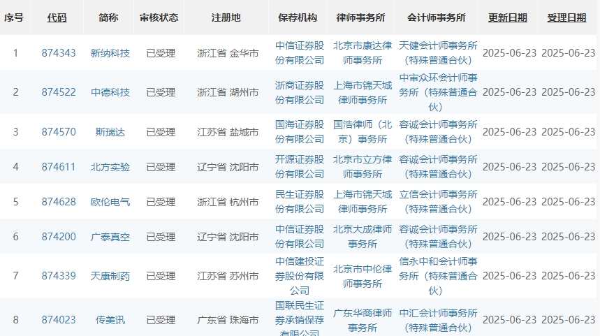 北京 6 月 23 日消息:北交所官网显示,截至央广财经记者发稿时间,当日共有 8 家企业申请 IPO 受理。至此,6月份已有25家企业获得北交所的 IPO 受理资格。值得注意的是,在今年前五个月,共有多家企业的 IPO 申请被北交所受理,具体数字为18家。