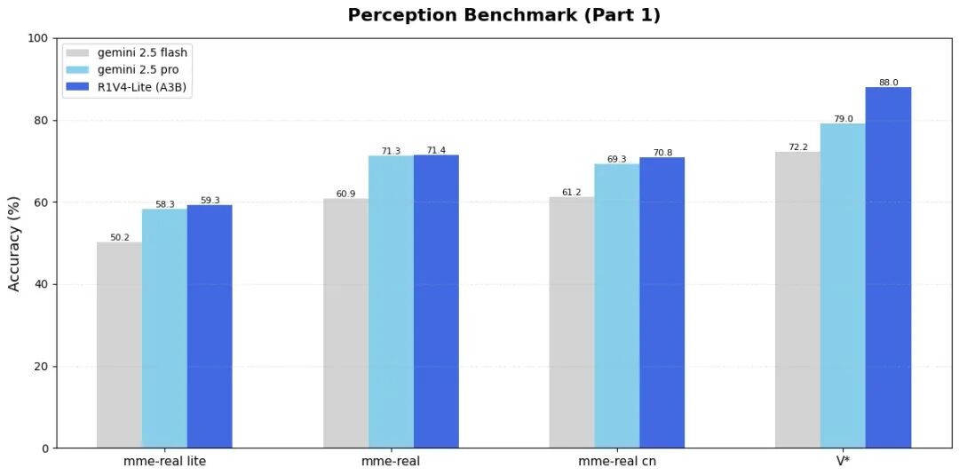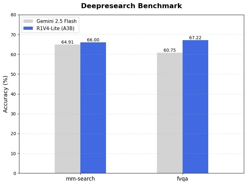 从表现上看,R1V4-Lite在多模态DeepResearch类任务中脱颖而出:在mm-search上以66分远超Gemini 2.5 Flash的64.9分,在FVQA上以67分较明显胜过Gemini 2.5 Flash的60.8分。这一系列成绩无疑极大地验证了「图像操作×深度推理交织训练」范式在实践中的有效性。