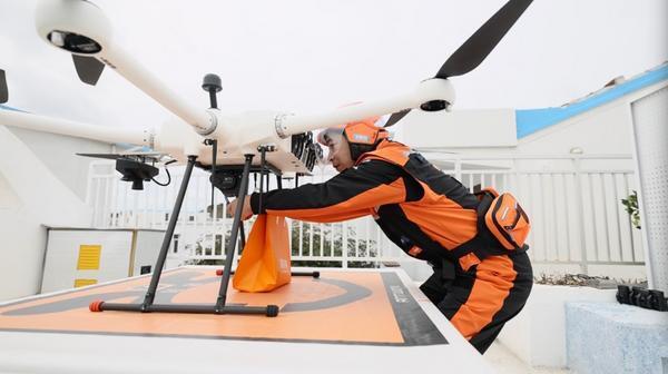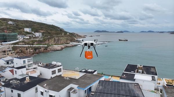 以下是改写后的文字:(图片说明:淘宝闪购无人机为游客与海岛居民搭起了便捷畅通的“空中走廊”。)
