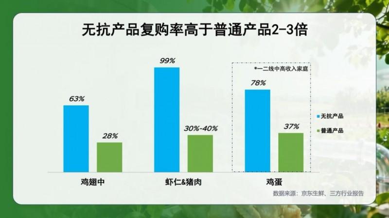 陈女士的选择并非特例京东生鲜数据显示:无抗产品的复购率普遍高于普通产品的2-3倍,超过51%的妈妈群体已将“无抗生素残留”作为选购食品的第一标准。随着“吃得健康”的需求不断攀升,无抗鸡肉正在从一个小众选项,迅速成长为消费者心中的新标准。“餐桌新标配”。