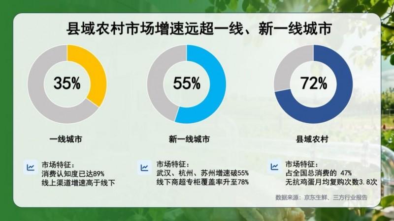 更让人惊喜的是县域市场的表现。京东数据显示,2024年,县域农村无抗食品的市场增速达72%,远远超过了一线城市。这类消费者愿意为“适度健康溢价”买单,并且无抗鸡蛋的月均复购次数达到3.8次。