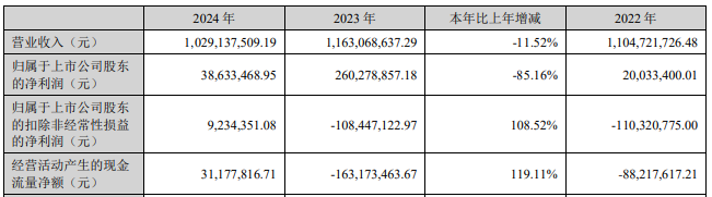 2024年,东土科技实现营业收入10.29亿元,同比下降11.52%;归属于上市公司股东的净利润0.39亿元,同比降低85.16%;扣除非经常损益后的净利润为-1.08亿元;经营活动产生的现金流量净额为0.31亿元,比上年同期下降了1.63亿元。