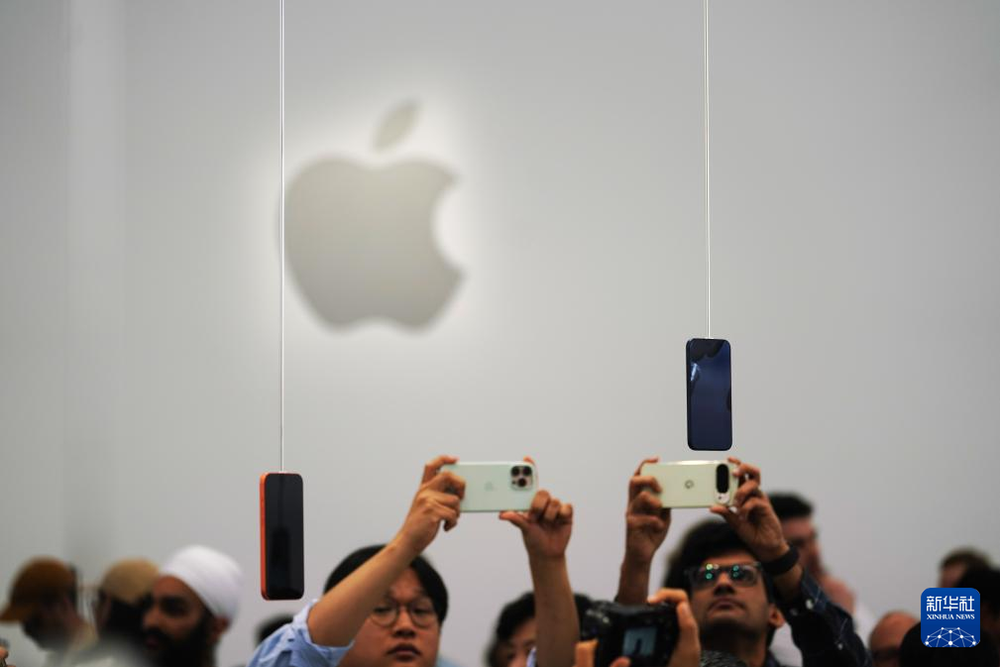 这张照片摄于美国加州的丘珀蒂诺,拍摄时间是2023年9月9日。照片中展示的是苹果公司推出的新款智能手机。(拍摄者为新华社记者吴晓凌。)