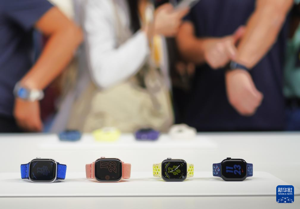 这张图片是新华社记者在2016年9月9日于美国加州的库比蒂诺市拍摄的。图片中显示了苹果手表。(新华社记者吴晓凌摄)