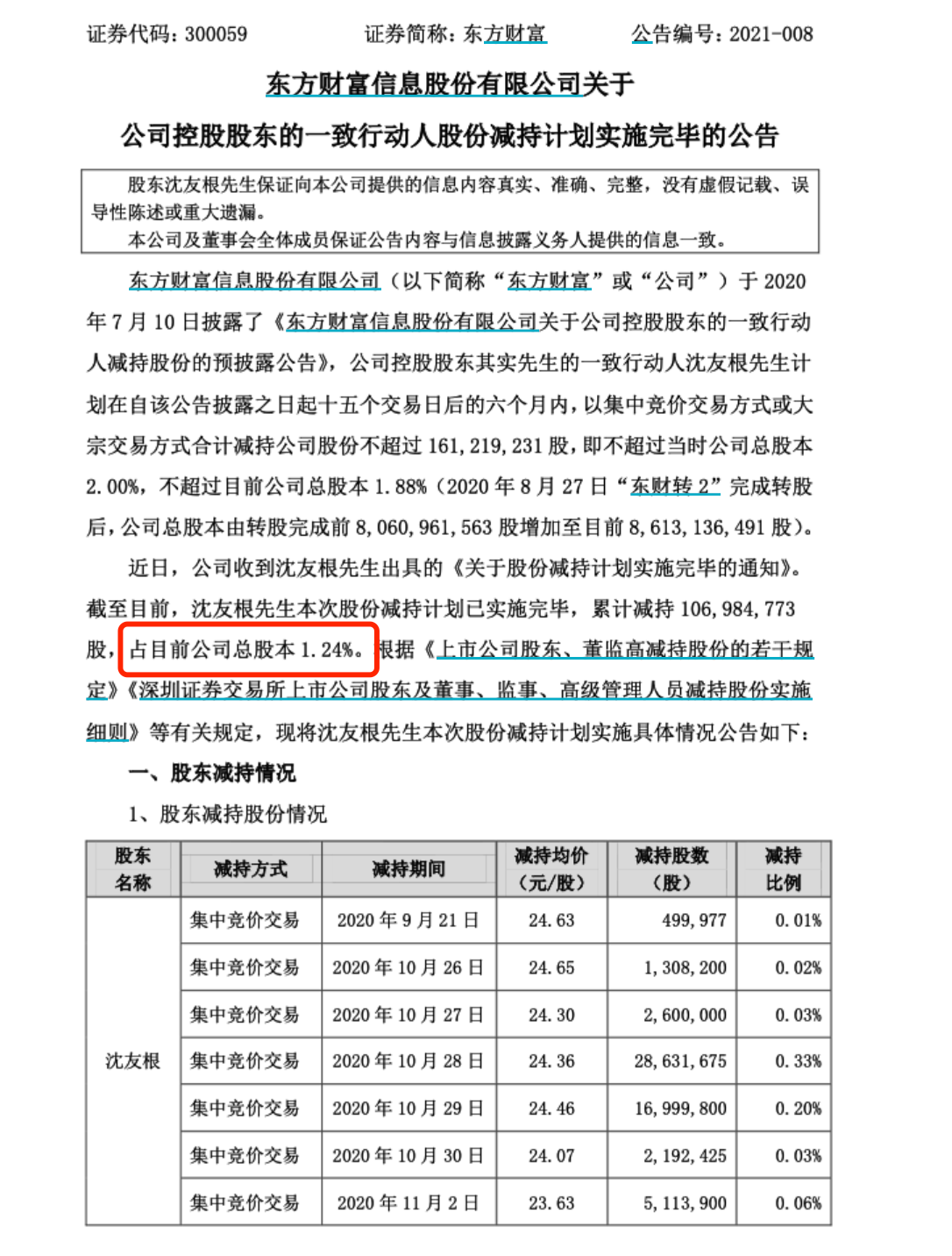 更早之前,沈友根也减持了东方财富股份。2021年2月,东方财富发布公告称,沈友根因个人资金需求,在2020年9月至2021年2月期间,采用集中竞价交易方式或大宗交易方式累计减持公司1.07亿股股份,占公司总股本的1.24%,减持均价为每股26.95元人民币。通过这些减持行为,他总共套现了28.83亿元人民币。