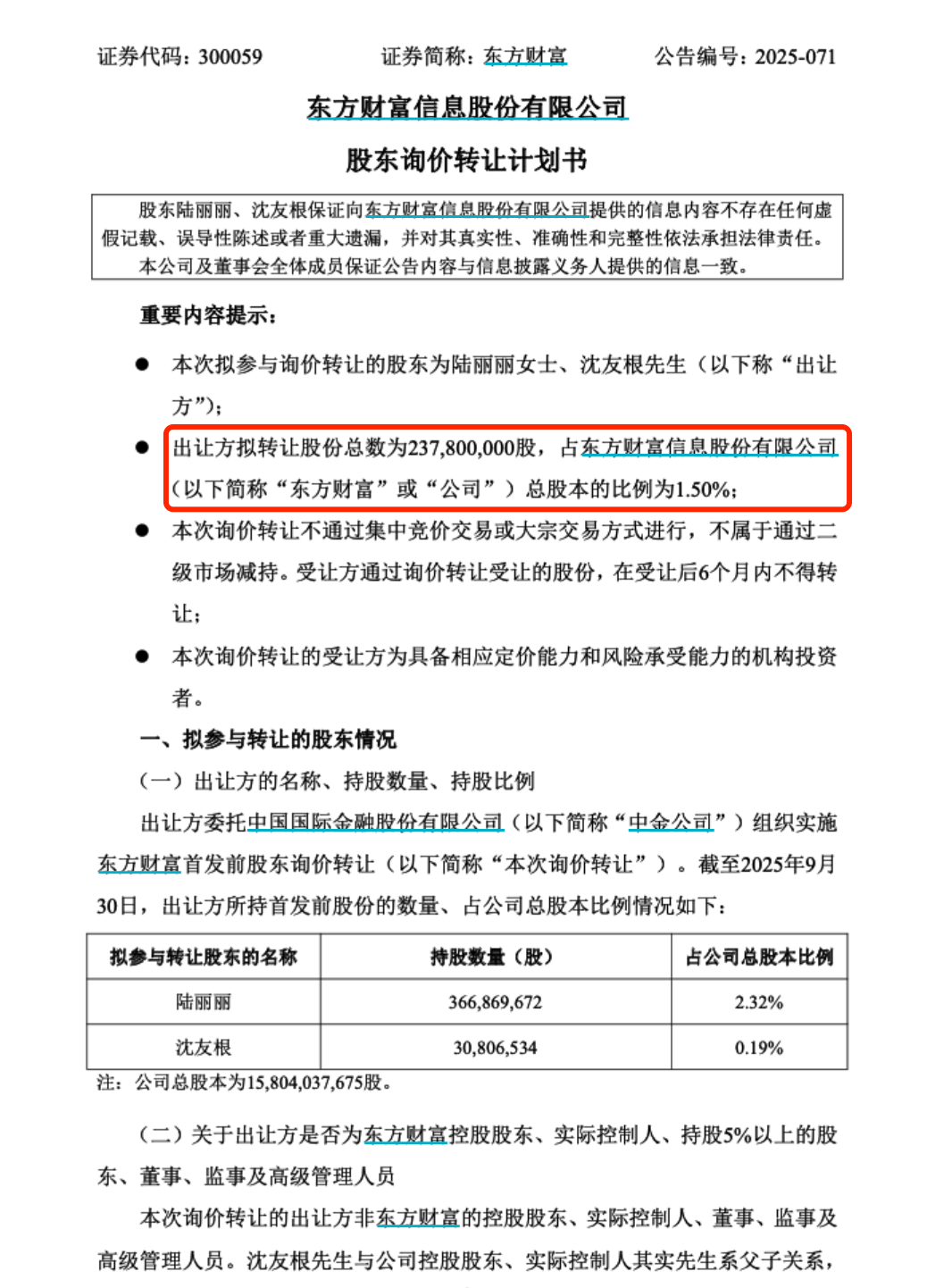 9月30日晚,东方财富发布了《股东询价转让计划书》公告。公告称,股东陆丽丽和沈友根计划以询价转让的方式转让2.38亿股股份,约占公司总股本的1.5%。转让原因为个人资金需求。此次询价转让将不通过集中竞价或大宗交易方式进行,不属于二级市场减持行为。受让方为具备相应定价能力和风险承受能力的机构投资者。受让方获得的股份在受让后的6个月内不得进行转售。