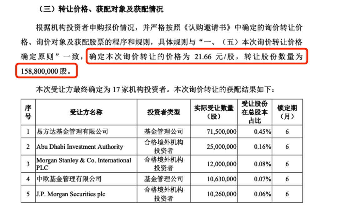 在《认购邀请书》规定的时间内,券商收到了来自37份《申购报价单》,确定本次询价转让的价格为21.66元/股。这意味着沈友根获得了约34.4亿元的资金。最终,受让方确定的机构投资者共有17家,其中易方达基金占了沈友根转让部分总额的45%。