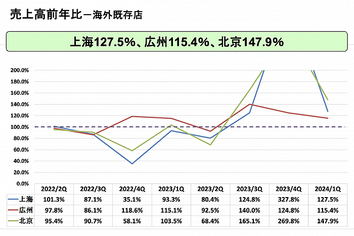 萨莉亚按分公司划分对中国海外市场进行运营分析,并汇总上海、广州和北京三地的业绩数据。第一季度,中国内地市场销售额大约为137.34亿日元(合人民币6.76亿元),而经营利润约为24.35亿日元(合人民币1.2亿元)。