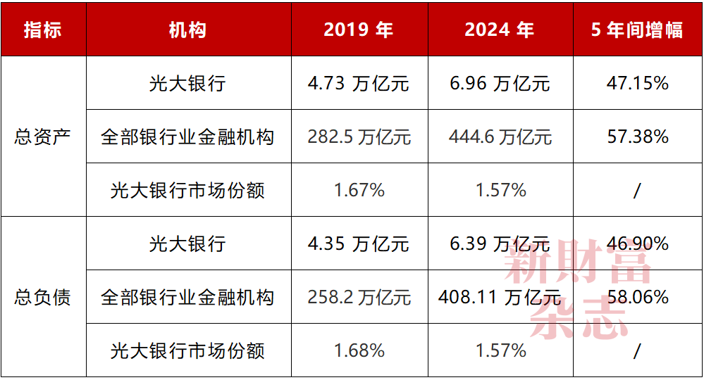 近年来,光大银行的增长速度落后于整个银行行业的平均水平。从2019年至2024年,该行总资产和总负债的平均增长幅度都远低于全行业超过十个百分点的标准,尤其是其核心贷款业务的增速更是大大落后,比银行业平均水平低了十七个百分点。