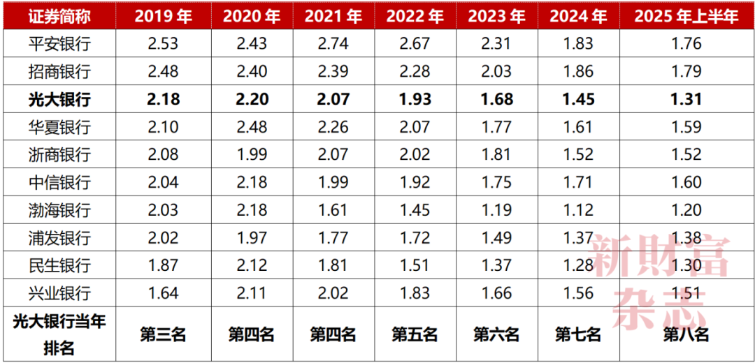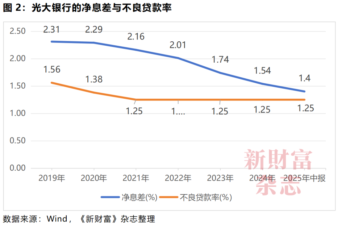 可以看出,近年来,光大银行的不良贷款比率始终维持在1.25%,而净利润收益率则不断下跌,与不良贷款比率之间空间缩小了,到了2025年上半年,其净息差跌至1.4%,两者之间的差异只剩下了0.15%(图2)。