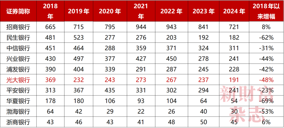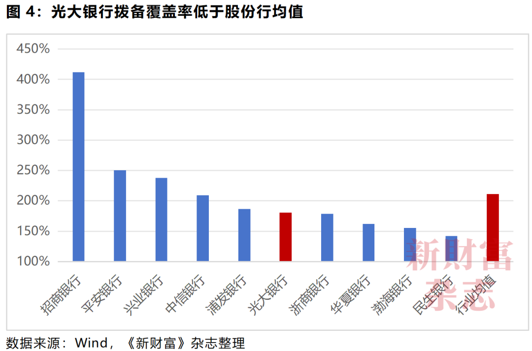 2024年年末光大银行拨备覆盖率高达180.59%,同期上市股份行的平均水平则在211.5%左右。招商银行、平安银行的拨备率分别达到了411.98%与250.71%,账面上更充分计提了不良贷款可能带来的损失,为预期损失提供了更厚实的“缓冲垫”。