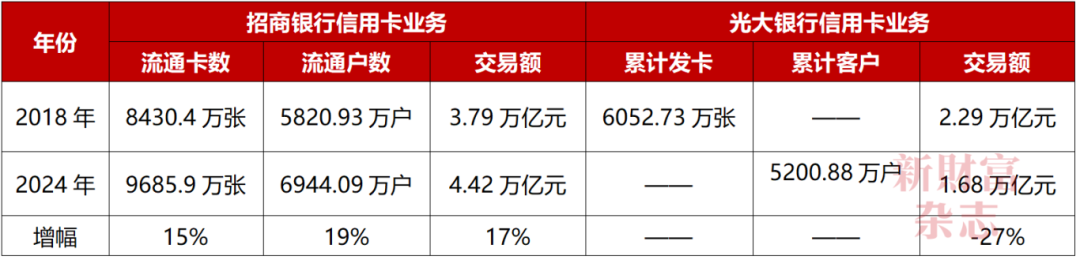 表格六展示的是招商银行和中国光大银行信用卡业务的增长情况。