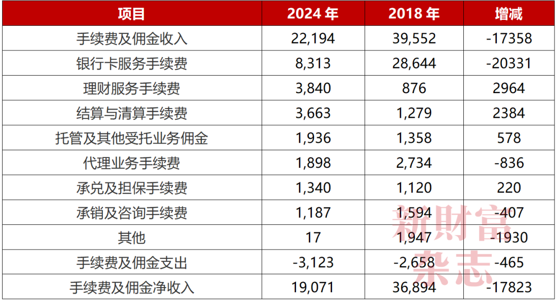 表格7:光大银行(截至2018年和2024年的手续费及佣金细分项目对比)