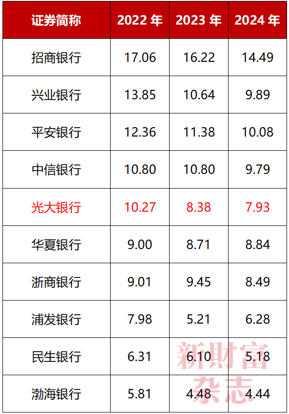 营收下滑不可避免对光大银行盈利能力有所影响。2022年,该行净资产收益率(ROE)为10.27%,在排名中位列第五。至2024年,ROE已降至7.93%,排名下降到第七名,此前无法与华夏银行和浙商银行抗衡。