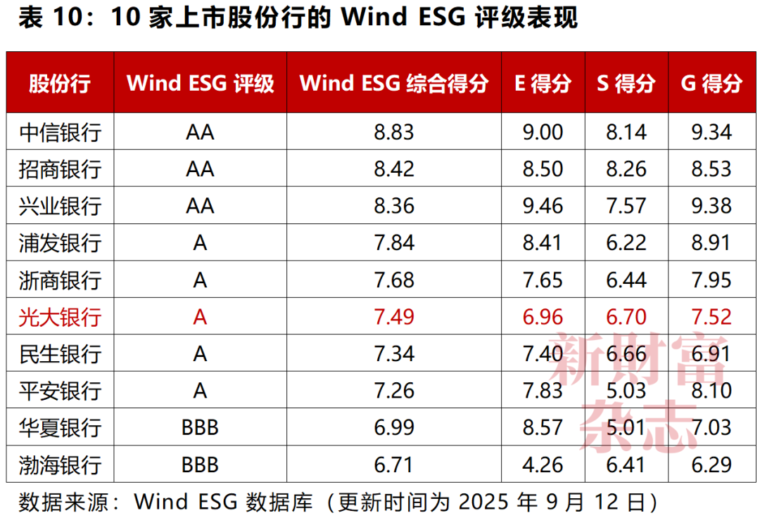 在Wind的ESG评级中,光大银行获得了A级综合评级。而中信银行、招商银行和兴业银行被评为AA评级;他们的评分是7.49分,低于中信银行、招商银行、兴业银行、浦发银行和浙商银行(表10)。