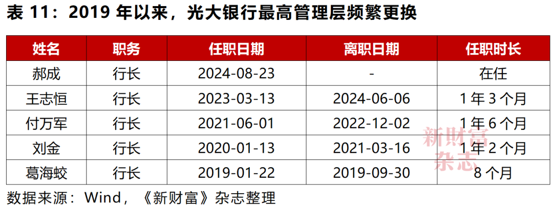 此外,在过去的两年多的时间里,光大银行经历了五任行长的换帅,每任行长的任期都不到14个月。这一现象在国有股份制银行里是十分罕见的。(表11所示)