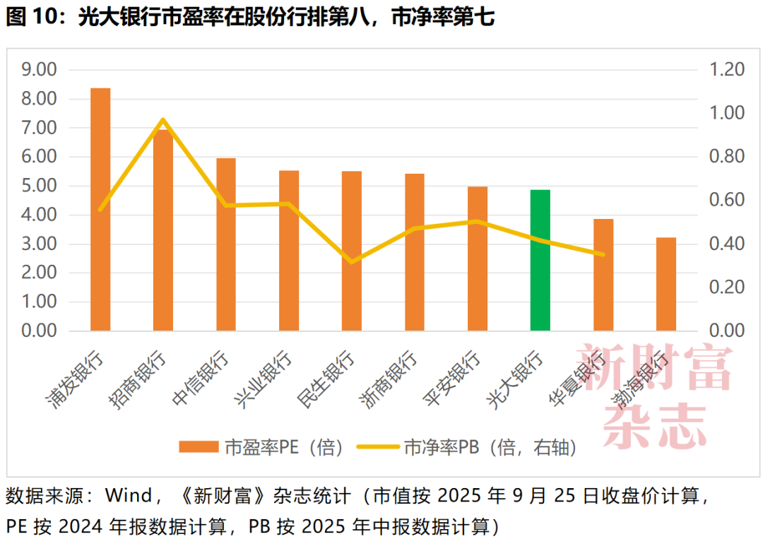 目前光大银行的市值约2000亿元,股价仅为每股4.87元,处于股份制银行中倒数第八位,排在华夏银行和渤海银行之后;市净率也只有0.42倍,在股份行中仅次于华夏银行、民生银行与渤海银行(图10)。 原文