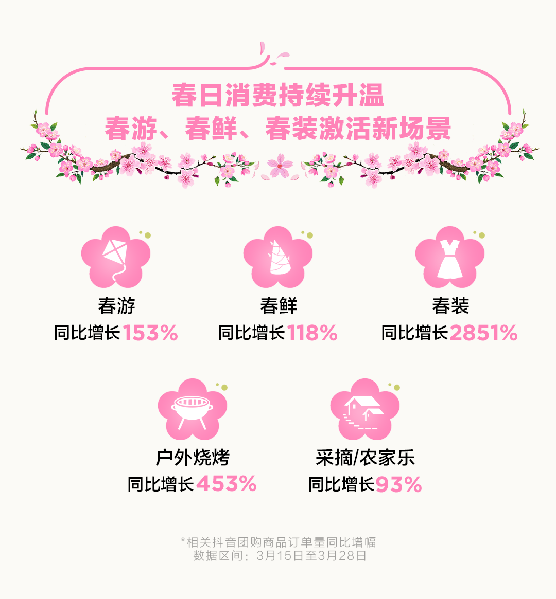 抖音生活服务部门的官员透露,从春天消费季节和即将到来的清明假期开始起,该平台将持续增加团购商品种类,通过优质的娱乐内容来吸引更多的实体商家以及特色旅游景点吸引更多客流,从而帮助各地在美丽的春季解锁更多有趣的经济模式,并享受美好的春日时光。