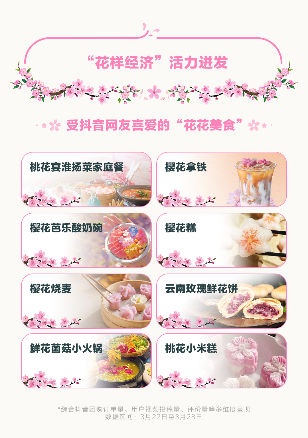 古人讲究时令而食,素有“以花入馔”的传统。如今,该习俗已渗透到现代餐饮文化中,催生出春令消费热浪,在餐饮商家推出了各式时鲜美食。“桃花宴”家庭餐、樱花拿铁、樱花芭乐酸奶碗等茶饮商家还上线了鲜花主题商品,如樱花糕、樱花烧麦、云南玫瑰鲜花饼、鲜花菌菇小火锅、桃花小米糕……这些以花为主题的美食,通过短视频和直播,在网上得到了更多网友的喜爱。