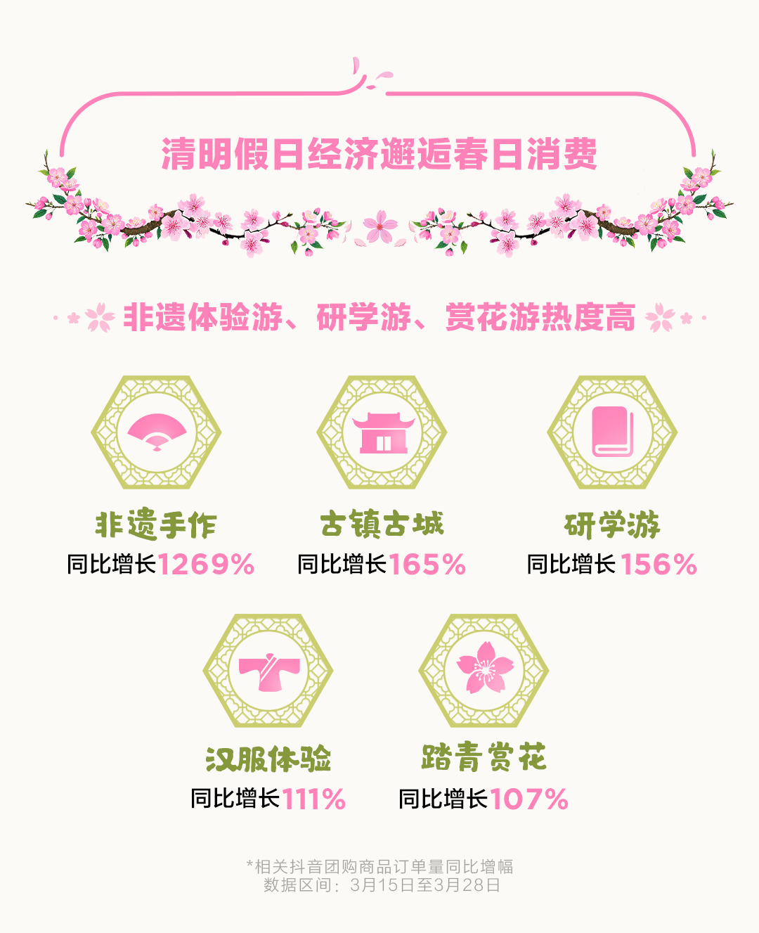 近日,抖音生活服务发布春日消费数据观察报告显示,消费者由赏花、吃花带动的“花样经济”发展趋势在3月持续升温,并预测清明假期前热门文旅目的地及消费倾向。报告显示,自3月15日至3月28日期间,春游、春鲜抖音团购订单量同比增长了153%和118%,为消费者带来丰富的赏花、吃花体验。“以花入馔”已成为时令消费新习俗,包括桃花宴、樱花拿铁、樱花糕等美食深受网友喜爱。清明节前古镇游、研学游、赏花游的抖音团购订单量同比增幅更是超过了107%。