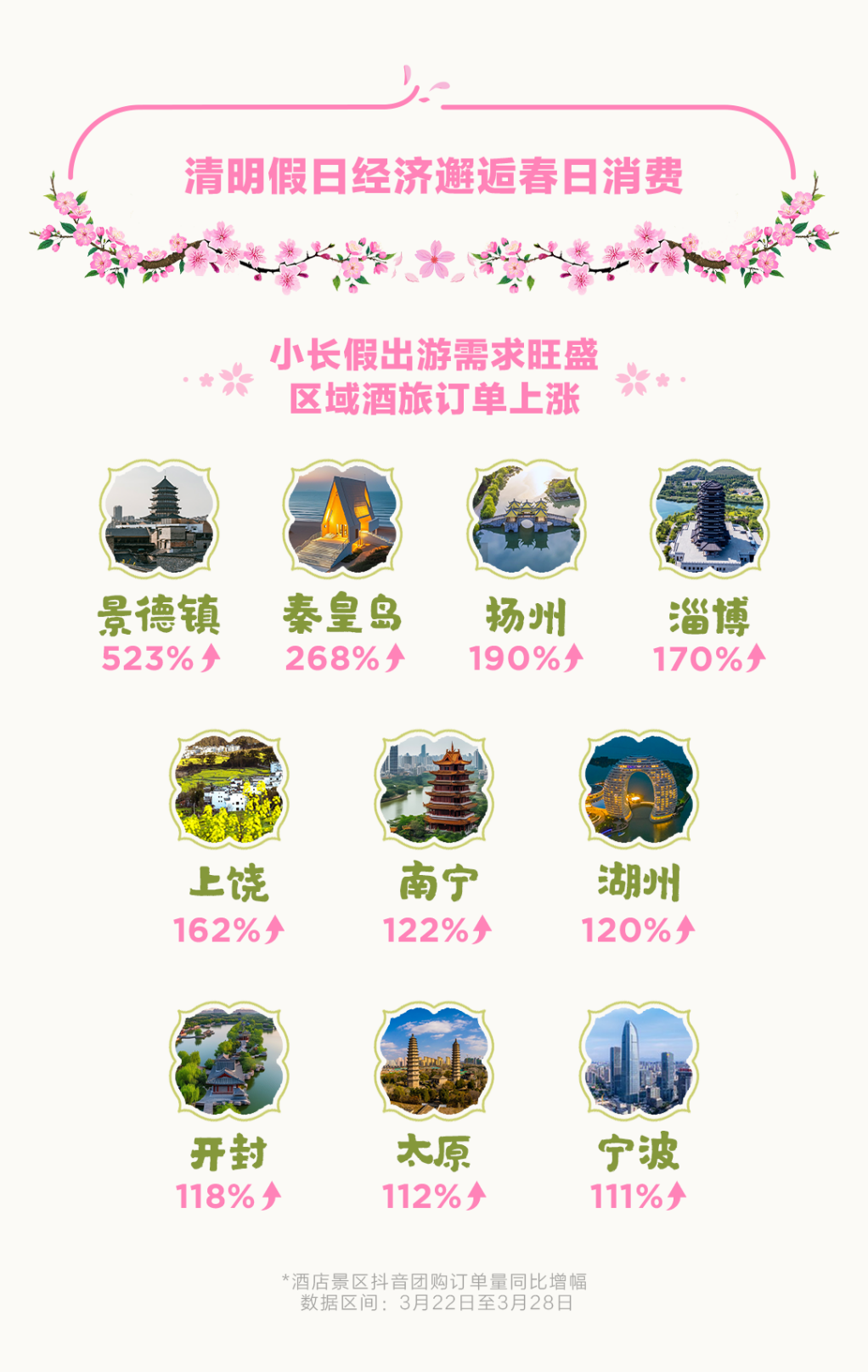 不少城市的酒旅团购订单在清明节前呈现出显著的增长态势。景德镇的酒店景区抖音团购订单同比增长523%,秦皇岛酒店景区订单同比上涨268%;扬州、淄博和上饶的酒店及景区团购订单分别增长190%、170%和162%。而南宁、湖州、开封、太原以及宁波的相关团购预订量也远超去年同期的水平,同比翻倍以上。